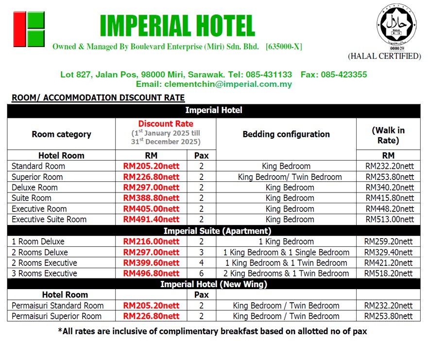 IMPERIAL PALACE HOTEL is located in Miri City, the second largest city in Sarawak, Malaysia. It is a preferred business class hotel that offers comfortable yet affordable accommodation. It is also a gateway to your relaxing holiday and business. The hotel is approximately 25-minute drive from Miri Airport and surrounded by retail shops, cafe, food & beverage outlets, restaurants and bakeries, supermarket and department store, entertainment and clubbing centres.