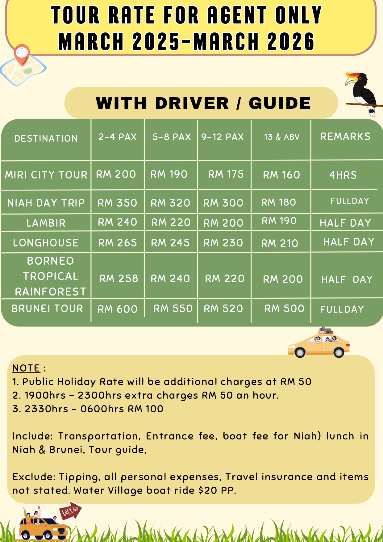 Date: 29th November 2025, Saturday Duration: 8:00 AM – 12:00 PM (4 hours) Proposed highlights: Piasau Nature Reserve and Lutong Beach (drive through), Curtin University Malaysia, Canada Hill, Miri Handicraft Centre, Tamu Muhibbah Market, Coco Cabana and Marina Bay Fee (depending on the number of participants): RM200 per person (2-4 pax), RM190 per person (5-8 pax), RM175 per person (9-12 pax), RM160 per person (13 pax and above), RM135 per person (for children below 12 years old).